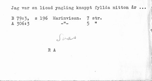 //// Jag var en lioad yngling knappt fyllda nitton år ... < //// B 79:3 > s 196 Marinvisan. 7 str. //// a 306:3 5 " 1 //// H //// r a //// • »y ////