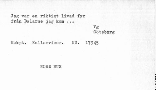 //// Jag Tar en riktigt livad fyr från Dalarne jag kom . //// Vg //// Göteborg //// Mskpt. Eallarvisor. EU. 17945 //// NORD HUS //// i ////