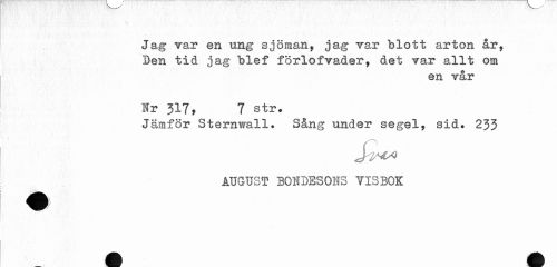 //// Jag var en ung sjöman, jag var "blott arton år, Den tid ja^e blef förlofvader, det var om //// en vår //// Hr 317, 7 str. //// Jämför Sternwall. Sång under segel, sid. 233 ////