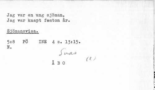 //// Jag var en ung sjöman, Jag var knapt femton år. //// Sjömansvisa. //// 5:8 PÖ INE 4 s. 13:15. //// U. j //// J iA-t^-J I //// A 3 0 j //// T //// F //// f f //// u ////