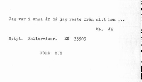 //// ¦ //// I //// Jag Tar i unga år då jag reste från mitt hem ... //// Me, Jä i //// ¦ //// Mskpt. Rallarrisor. EU 35903 //// NORD MUS t ////