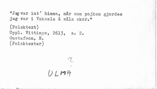//// "Jsgvar int' himma, når som pojken gjordes jag var i Taksala å såla skor*" //// (Polsktext) //// Uppl. Tittinge, 2613, s. 2# Gustafson, E. (Polsktexter) //// 'i;;.-. . //// fr //// ULHFt //// ^^ 1 ////