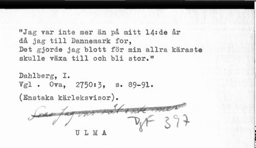 //// 11 Jag rar inte mer än på mitt 14: de år då jag till Dannemark for, Det gjorde jag blott för min allra käraste skulle växa till och bli etor." //// Dahlberg, I. //// Ygl . Ova, 2750s 3, s• 89-91• //// (Enstaka kärleksvisor). //// U L M A ^ I ////