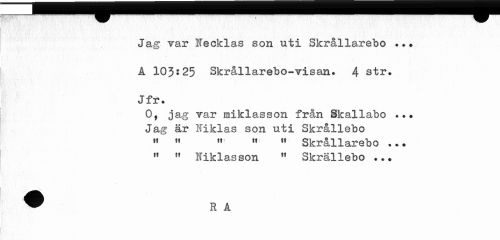 //// Jag var lecklas son uti Skrållarebo ? A 103*25 Skrållarebo-visan* 4 str» Jfr* //// 0, jag Tar miklasson från Skallabo ? .* Jag är Niklas son uti Skrållebo 11 11 « » !t Skrållarebo •.. n " Niklasson H Skrällebo ..* ////