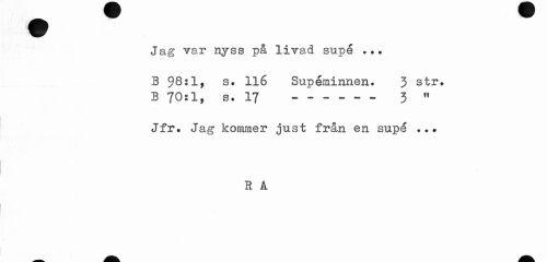 //// Jag var nyss på livad supé . .. //// B 98*1» s. 116 Supéminnen. 3 str. B 70:1, s. 17 --- 3 w //// Jfr. Jag kommer just från en supé ... //// r a ////