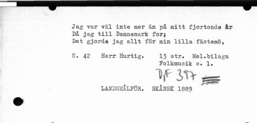 //// '" 9 ' " . //// Jag Tar Täl inte mer än på mitt fjortonde år //// Då jag till Dannemark for} //// Det gjorde jag allt för min lilla fästemö, //// 3. 42 Herr Hurtig» 13 str» Mel.bilaga //// Folkmusik s. 1. //// LMDSMÄLFÖR. SKÅNSK 1889 ^^ ////