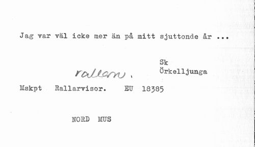 //// Jag var väl icke mer än på mitt sjuttonde år ... //// Sk //// r&Jjernj , Örkelljunga //// Mskpt Rallarvisor. EU 18J85 //// HORD MUS ////