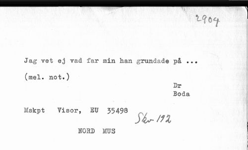 //// - -T //// Jag vet ej vad far min han grundade på ... (mel. not.) //// Dr //// Boda //// \ / //// Mskpt Tisor, EU 35498 //// yi^/fz //// NORD MUS ////