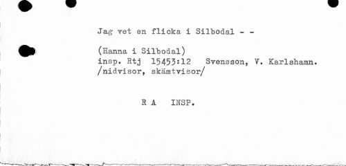 //// ^r s ^^^ //// Jag vet en flicka i Silbodal - - //// ÉÉ| (Hanna i Silbodal) //// insp. Rtj 15453*12 Svensson, T. Karlshamn. /nidvisor, skämtvisor/ //// R Å INSP. ////