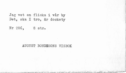 //// Jag vet en flicka i vår by Det, ska I tro, är doekety //// Hr 286, 8 str. //// AUGUST BOIfDESOIS VISBOK ////