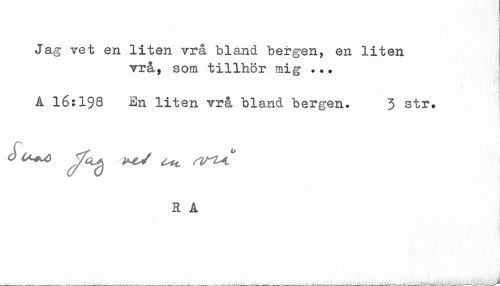 //// Jag vet en liten Trå bland bergen, en liten //// vrå, som tillhör mig ... //// ] //// Å 16:198 En liten Trå bland bergen. 3 str. //// R A //// ___ ////
