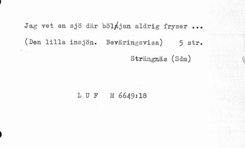 //// Jag Tet en sjö där böl/jan aldrig fryser ... //// . ¦ f //// (Den lilla insjön» Beväringsvisa) 5 str. //// Strängnäs (Sdm) //// LO M 6649:18 //// i //// i ////