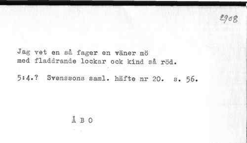 //// I //// Jag Tet en så fager en väner mö //// med fladdrande lockar ock kind så röd. //// ^ * //// 5:4»? Svenssons saml. häfte nr 20. s. 56. //// i B 0 ////