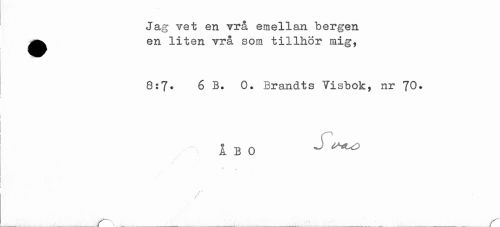 //// Jag vet en vrå emellan bergen ^^ en liten vrå som tillhör mig, //// 8:7* 6 B. 0. Brandts Visbok, nr 70» //// ÅBO « ^ //// ...r •. a...i___: i___r ////