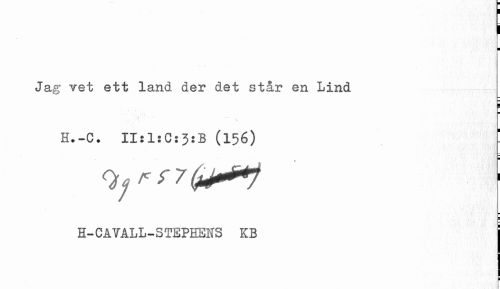 //// I ¦ //// Jag vet ett larid der det står en Lind //// ¦ //// ¦ //// . N //// H.-C. II:1:C:3:B (156) //// ¦ //// < //// ¦ ¦ //// H-CAVALL-3TEPHEKS KB ////