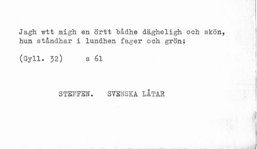 //// : £ i //// Jagh wtt migh en örtt bådhe dägheligh och skön, ! //// hun ståndhar i lundhen fager och grön; //// (Gyll. 32) s 61 i //// i 1 //// i 1 //// STEFFEN. SVENSKA LÅTAR j //// i //// I ////
