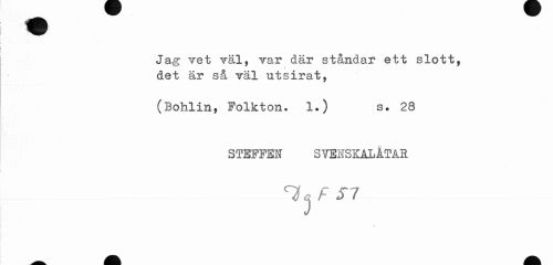 //// Jag vet väl, var där ståndar ett slott, det är så väl utsirat, //// (Bohlin, Folkton. 1.) s. 28 //// STEFFEN SYENSKALÅTAR //// I^F S7 ////