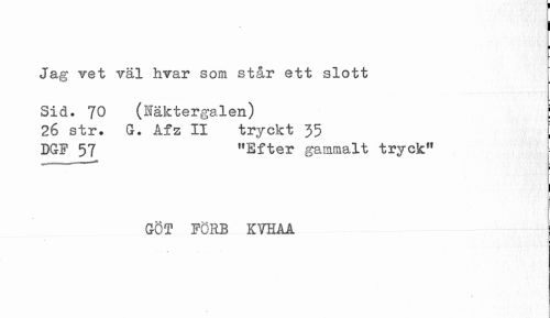 //// i ¦ //// Jag vet väl hvar som står ett slott //// ¦ //// Sid. 70 (näktergalen) j //// 26 str. G. Afz II tryckt 35 //// DGF 57 "Efter gammalt tryck" //// 1 //// 1 //// GÖT FÖRB KVHAA //// • . ¦» - //// ! ////