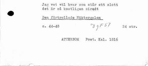 //// Jag vet väl hvar sota står ett slott det är så kostligen siradt //// # //// Den förtrollade Häktergalen //// s ? 44-48 ^ J F ? 24 str. //// ATTESBOM Poet. Kal- 1816 //// ' 4 v*. ////
