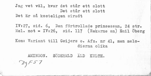 //// Jag Tet väl, hvar det står ett slott //// Det står ett slott Det är så kosteligen siradt //// IY:27> sid. 6, Den förtrollade prinsessan, 24 str. Hel. not = 17:26, sid. 117 (Sekarne sn) Emil Öberg //// Kom: Yariant till Geijers o. Afz* nr 41* ^^n melodierna olika //// AMII3QI. SQDESMLD ALD KULTE. //// * J //// _ ^j ////