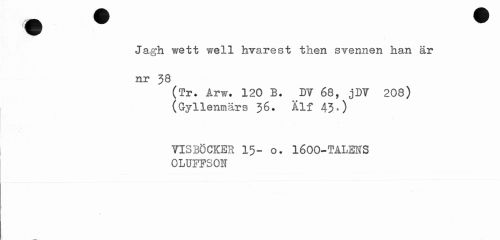 //// * //// Jagh wett well hvarest then svennen han är nr 38 //// (Tr. Arw# 120 B. BY 68, jDT 208) //// (Gyllenmärs 36. Alf 43.) //// TISBÖCKER 15- o. 1600-TALENS OLUFFSON ////