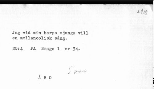 //// W v ' im //// *f/S //// Jag vid min harpa sjunga vill en raellancolisk sång* //// 20:4 pa Brage 1 nr 34. //// .-O //// J //// ÅBO . ////