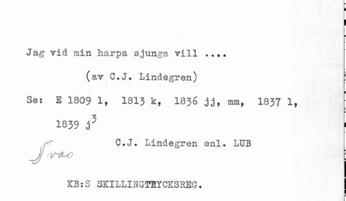 //// ¦ //// i ¦ //// s- * //// Jag vid min harpa sjunga vill ... //// (av C.J. Lindegren) //// . < _ w //// Se: E 1809 1* 1813 k, I836 jj» mm, 1837 1, //// 1839 j3 ; //// JC.J. Lindegren enl. LUB //// : //// KB:S SKILLIKGTKYCKSREG. ////