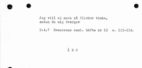 //// Jag vill ej mera på flickor tänka, sedan du mig övergav //// 9:4#? Svenssons saml. häfte nr 12 s. 123-124* //// ÅBO ////