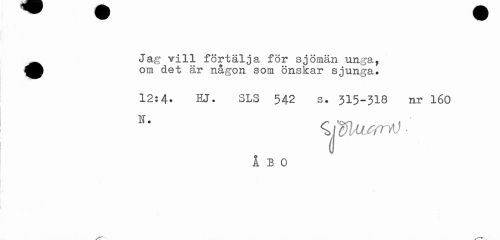 //// •Jag Till förtälja för sjömän unga, om det är någon som önskar sjunga. //// 12:4. HJ. SLS 542 s. 315-318 nr 160 //// 11 * . //// ÅBO ////