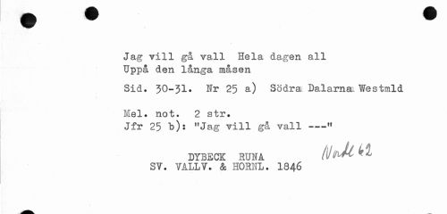 //// Jag vill gå vall Hela dagen all Uppå den långa måsen //// Sid. 30-31* Nr 25 a) Södra Dalarna; Westmld //// Mel. not. 2 str. //// Jfr 25 b): "Jag vill gå vall ---H //// DYBECK RUNA kl //// ST. TALLT. & HÖRNI. I846 ////