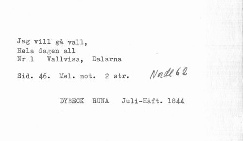 //// Jag vill gå vall, //// Eela dagen all //// Hr 1 Vallvisa, Dalarna //// Sid. 46. Mel. not. 2 str. ^HtU^ //// DYBECK HOTA Juli-Häft. 1844 //// ' . ' • • > I ////