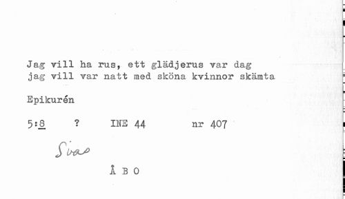 //// i //// \ //// j //// Jag vill ha rus, ett glädjerus var dag //// jag vill var natt med sköna kvinnor skämta 1 //// Epikurén //// 5:8 ? 113 44 nr 407 ¦ //// I BO ////