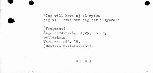 //// "Jag vill hava ej så mycke //// jag vill hava den jag har i tycke." //// (Fragment) //// Ing. Ifordingrå, 1925» s. 17 Zetterholm* Variant sid. 18. (Enstaka kärleksvisor). //// U L M A ////