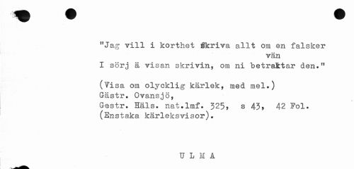 //// j i //// ¦ ^ W ^ Jff //// "Jag vill i korthet Skriva allt om en falsker //// vän //// I sörj ä visan skrivin, om ni betraktar den." //// (?isa om olycklig kärlek, med mel.) Gästr. Ovansjö, //// Gestr. Häls. nat.lmf. 325> s 43> 42 Pol. (Enstaka kärleksvisor). //// ULM A ////