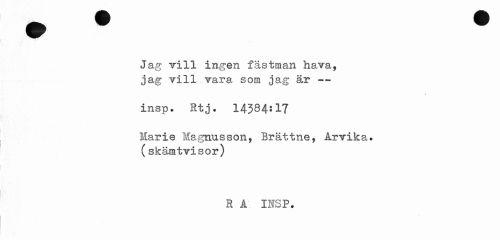 //// Jag- vill ingen fästman hava, jag vill vara som jag är - //// insp. Htj. 14384:17 //// Marie Magnusson, Brättne, Arvika. (skämtvisor) //// R A INSP. ////
