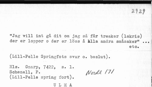 //// ZUf //// "Jag Till int gå dit om jag så får treaker (lakris) der er loppor o der er löss å illa andra småsaker" //// etc* //// * //// (Lill-Pelle Springfots svar o. beslut). //// Hls. Gnarp, 7422, s. 1. Sohenell, P. A/(riM //// (Lill-Pelle spring fort). j //// U L M A I ////