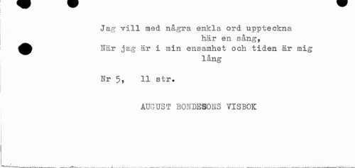 //// Jag vill med några enkla ord uppteckna //// här en sång, lär jag är i min ensamhet och tiden är mig //// lang //// Nr 5> 11 str. //// AUGUST BONBEBOHS VISBOK //// » ////