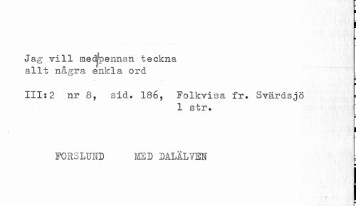 //// i //// i ¦ //// i //// Jag vill medjpennah teckna //// allt några enkla ord . //// ¦ //// 111:2 nr 8, sid. 186, Folkvisa fr. Svärdsjö //// 1 str. //// i //// FORSLUND MED dalälven i //// 1 ////