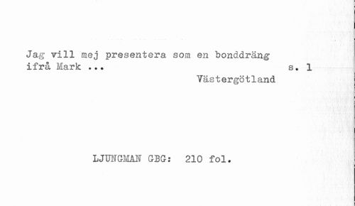 //// Jag vill mej presentera som en bonddräng ifrå Mark s* 1 //// Västergötland //// LJUNGMAN GBG: 210 fol. ////