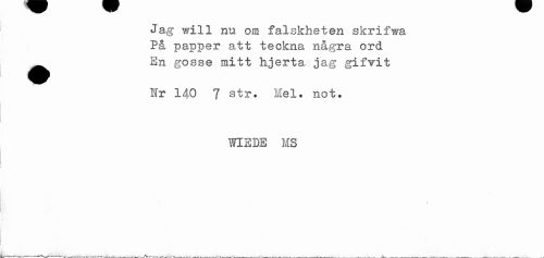 //// Jag will nu om falskheten skrifwa På papper att teckna några ord ^^ En gosse mitt h jerta jag gifvit //// Nr 140 7 str. Hel. not. //// WIEDE MS ////