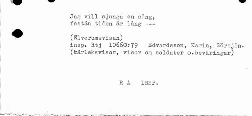 //// Jag vill sjunga en sång, fastän tiden är lång -- //// ^^ (Elverumsvisan) //// insp* Rtj 10660:79 Edvardsson, Karin, Sorsjön. //// (kärleksvisor, visor om soldater o.beväringar) //// R Å IHSP. ////