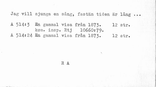 //// Jag vill sjunga en sång, fastän tiden är lång ... //// A 514:3 En gammal visa frän I873. 12 str. //// kom. insp. Htj 10660:79. //// A 514:24 En gammal visa frän 1873. 12 str. //// * //// f //// # //// 1 i //// H Å //// . * . - 1 t ////