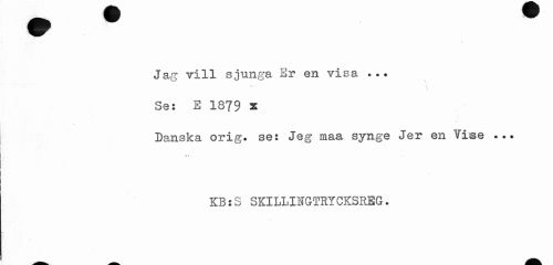 //// Jag vill sjunga Er en visa ... //// i //// \ //// Se: E 1879 x //// Danska orig. se: Jeg maa synge Jer en Yise ... //// » ? //// KB:S SKILLINGTRYCKSREG. ////