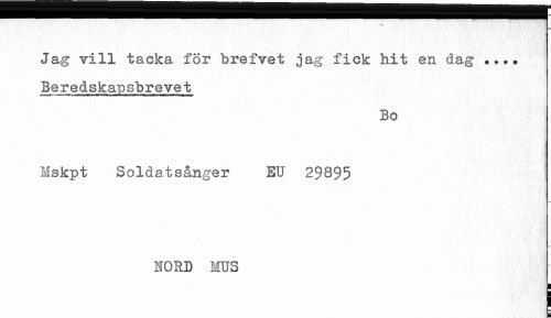 //// Jag Till tacka för brefvet jag fick hit en dag Beredskapsbrevet //// Bo //// Hskpt Soldatsånger EU 29895 //// HORD MUS ////