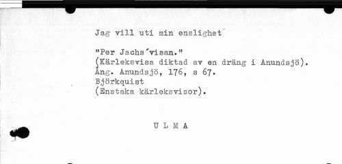 //// Jag vill uti min enslighet "Per Jachs'visan.11 //// (Kärleksvisa diktad av en dräng i Anundsjö). //// Ing. Anundsjö, 176, s 67* //// Björkquist //// (Enstaka kärleksvisor). //// U L M A ////