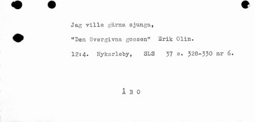 //// Jag ville gärna sjunga, //// "Den övergivna gossen" Erik Olin. //// 12:4. Nvkarleby, SLS 37 s. 328-330 nr 6. //// ÅBO ////
