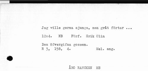 //// \ //// Jag ville gerna sjunga, men gråt förtar ... //// 12:4» NB Förf. Erik Olin //// Den öfvergifna gossen. R 3, 158, 4* Mel. ang. //// ---ÅBO RAICKEN KS ////