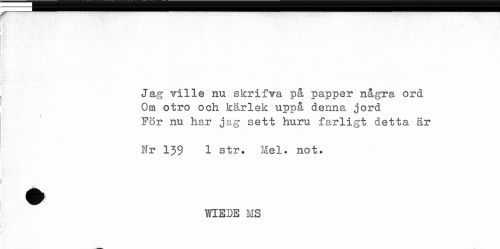 //// f" //// Jag ville nu skrifva på papper några ord //// Om otro och kärlek uppå denna jord //// För nu har jag sett huru farligt detta är //// Nr 139 1 str. Mel. not. //// p //// WIEDE MS ////