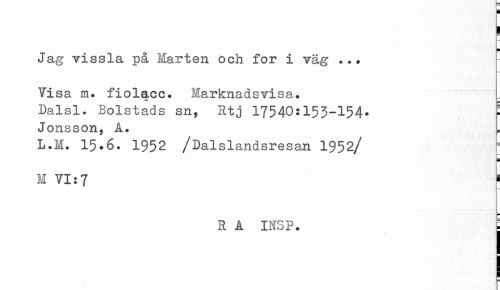//// I ¦ //// Jag vissla på Mårten och for i väg ... Yisa m. fiolq.cc. Marknadsvisa. //// Dalsl. Solstads sn, Htj 17540:153-154* - //// Jonsson, A. j. //// L.H. 15.6. 1952 /Dalslandsresan 1952/ ; //// U 71:7 f //// K A INSP. j //// \ ////