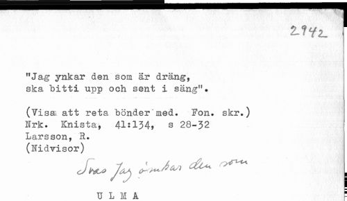 //// 2.1*2. i //// MJag ynkar den som är dräng, ska bitti upp och sent i säng"» //// (Visa att reta bönder med. Fon. skr.) Nr k. Knista, 41:134, s 28-32 //// Larsson, B. //// 7 //// (ifidTisor) //// UIA r ////